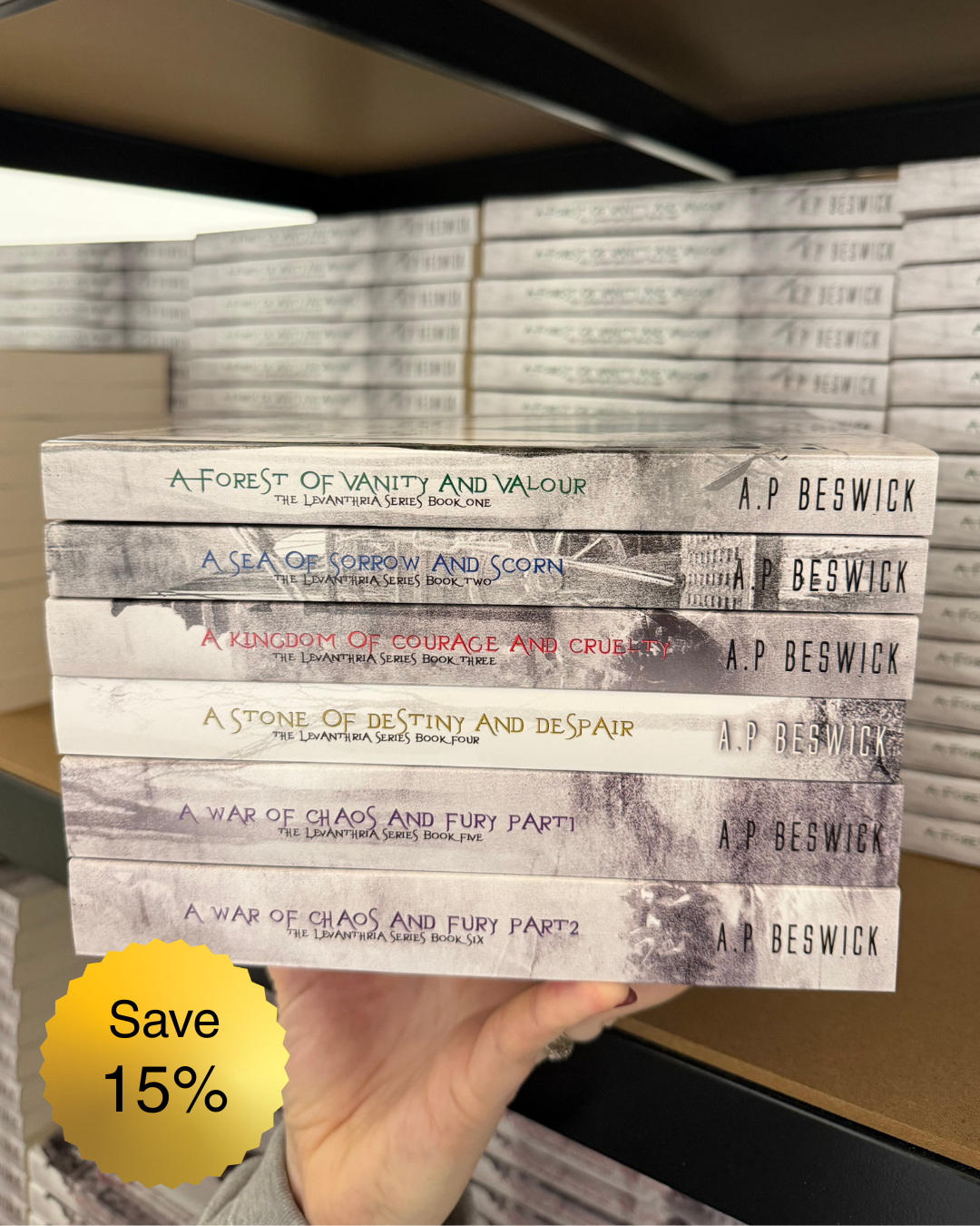 ✨ What You Get: - All 6 books in The Levanthria Series – the complete saga - Every copy signed by A.P Beswick – authentic author signatures - 15% OFF – save when you buy the bundle - Epic dark fantasy journey from beginning to explosive end - 6 interconnected stories – morally grey heroes, brutal stakes, no safe characters